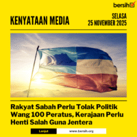 Gabungan Pilihan Raya Bersih dan Adil (BERSIH) menyeru rakyat Sabah untuk berdiri tegas menolak politik wang sepanjang kempen Pilihan Raya Umum Sabah kali ini. Pemerhatian kami mendapati hampir 50 kejadian yang boleh diperhatikan sebagai kesalahan pilihan raya. Sebahagian besar kesalahan yang direkodkan melibatkan penjamuan, pemberian hadiah dan barangan — termasuk